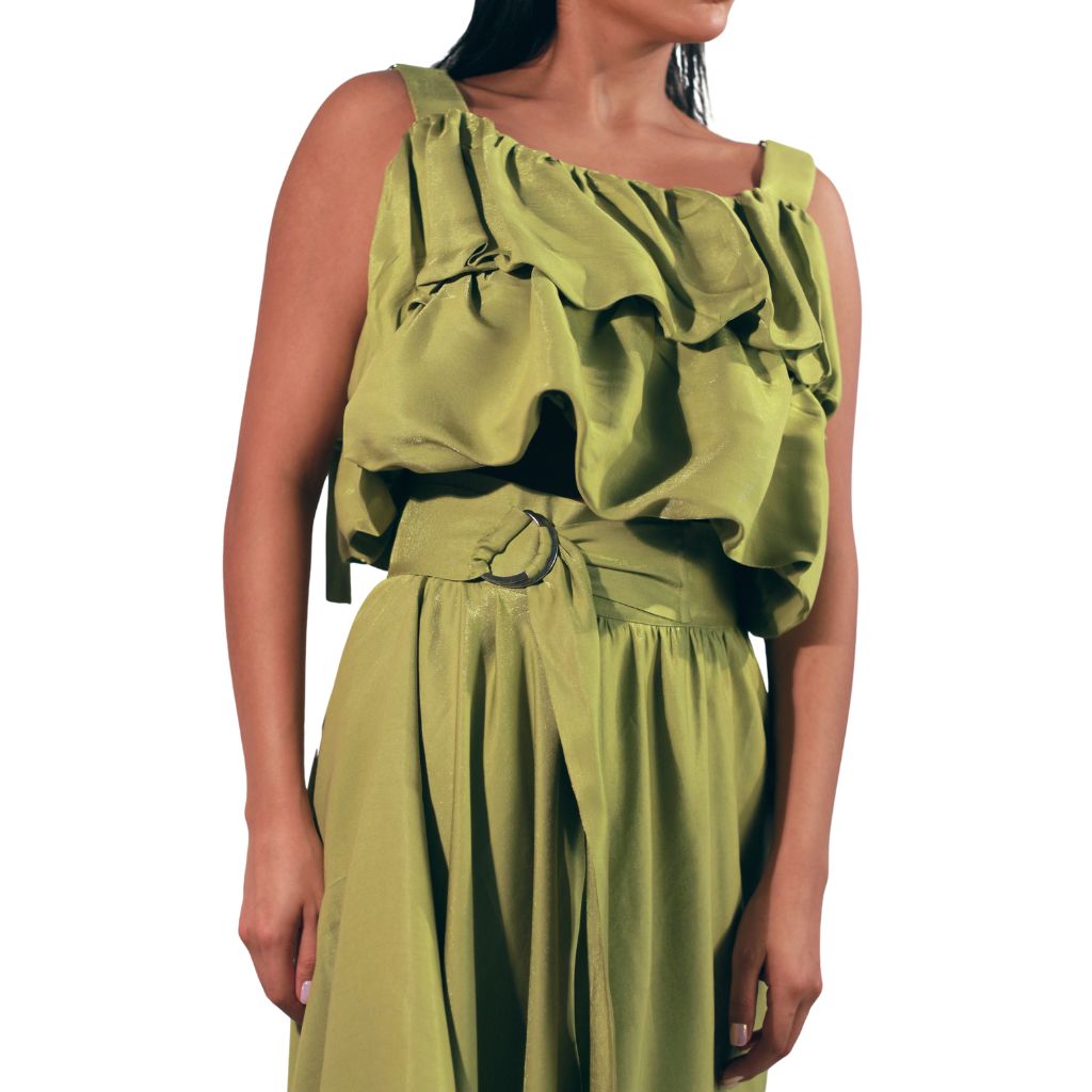 This stylish top combines sophisticated design with playful ruffles, offering versatile wear with adjustable straps. Shiny Bright Silky Linen is available in Green, Pink, and Black.