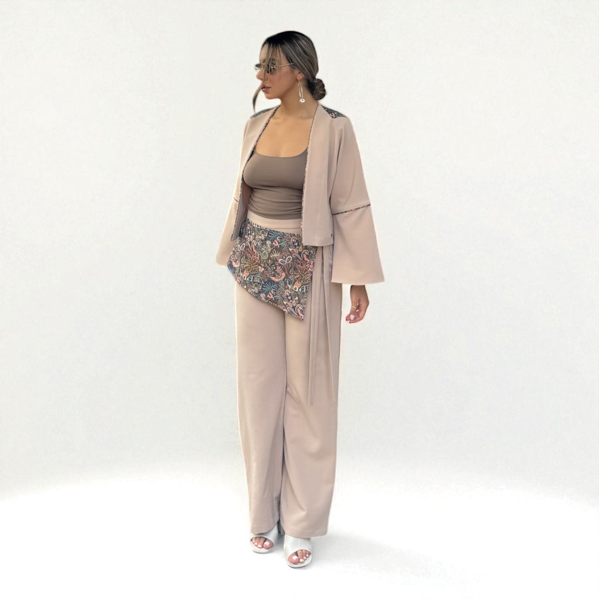 The Farin Pants offer a sophisticated fusion of elegance and heritage. Tailored in smooth beige crepe, these wide-leg trousers feature a striking Termeh overskirt that ties gracefully at the side, creating a versatile layered effect. A modern cut with timeless Persian artistry, perfect for elevating both casual and formal looks.