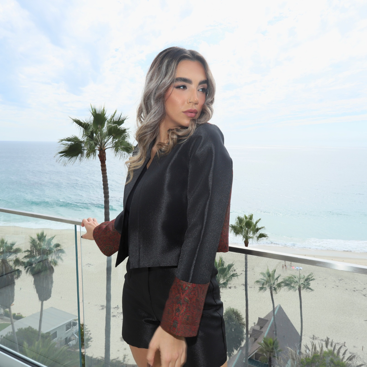 A true fusion of elegance and heritage. The Irandokht Coat features rich crimson Termeh detailing across the back and cuffs, paired with sleek black taffeta for a modern, structured silhouette. Designed to make a statement while keeping timeless Persian craftsmanship at its heart.