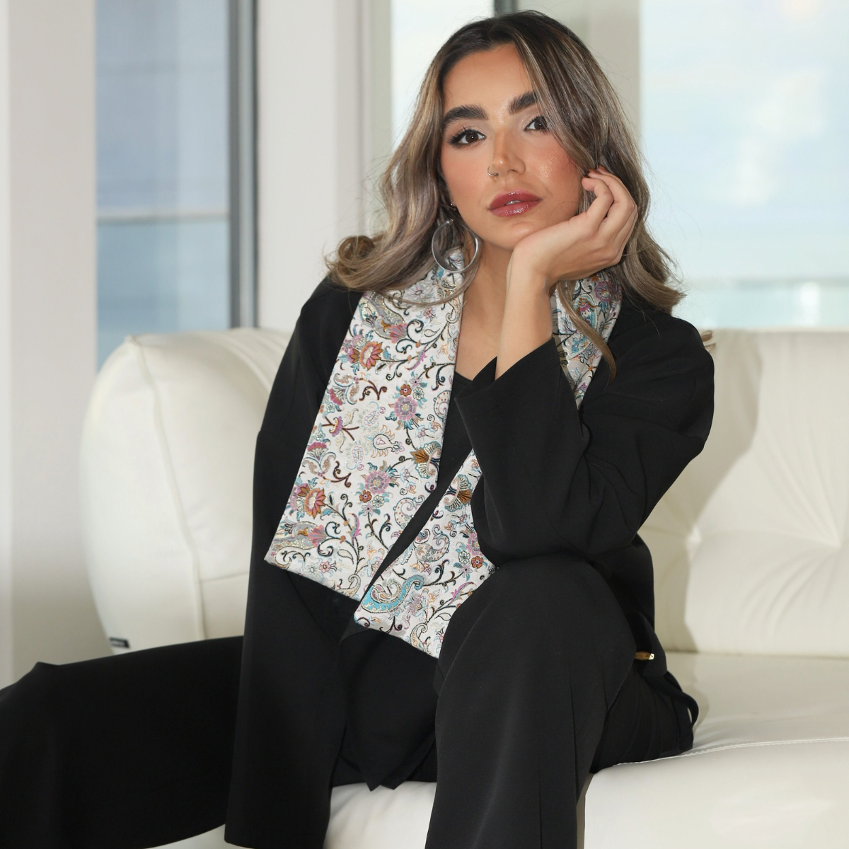 Sadaf Coat pairs rich black crepe with soft white Termeh, creating a subtle yet striking contrast that makes this piece unforgettable.